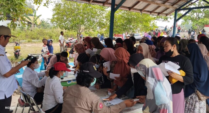 Ratusan ibu-ibu di Kelurahan Tanjung Pinang tampak berdesak-desakan untuk mendapatkan cap pada kupon yang mereka dapatkan dari Ketua RT, sebelum mengantre untuk menebus sembako bersubsidi, di halaman kantor Kelurahan setempat, Rabu (11/10/2023) siang.