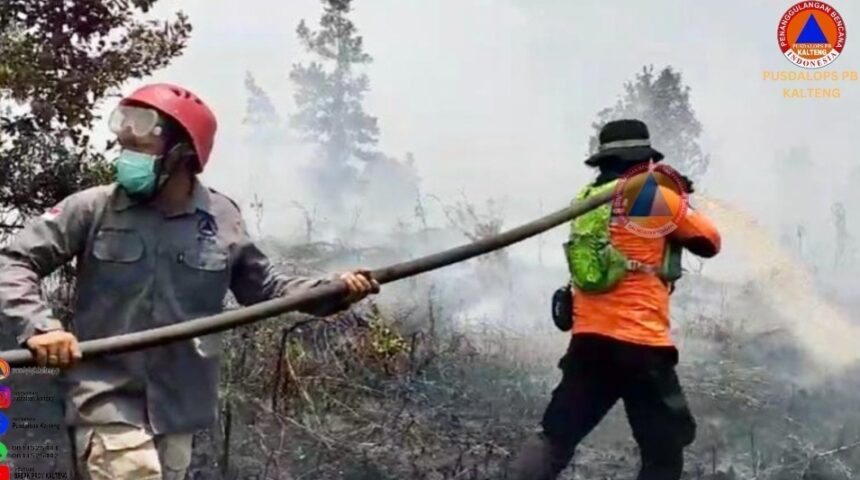 Petugas damkar saat melakukan upaya pemadaman api yang melalap lahan di batas antara Kota Palangka Raya dan Kabupaten Pulang Pisau.