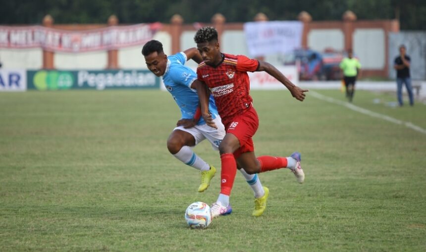 Pemain Kalteng Putra saat satu lawan satu dengan pemain Sulut United dalam laga di Stadion Tuah Pahoe Palangka Raya, Kamis (19/10/2023) sore.