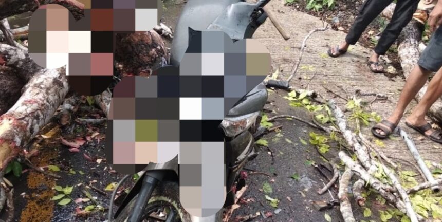 Namun di tengah perjalanan turun hujan lebat yang disertai angin kencang, sehingga korban menghentikan sepeda motor untuk memakai jas hujan. Ketika korban hendak melanjutkan perjalanan, tiba-tiba pohon karet besar tumbang dan menimpa korban yang tidak sempat menghindar.