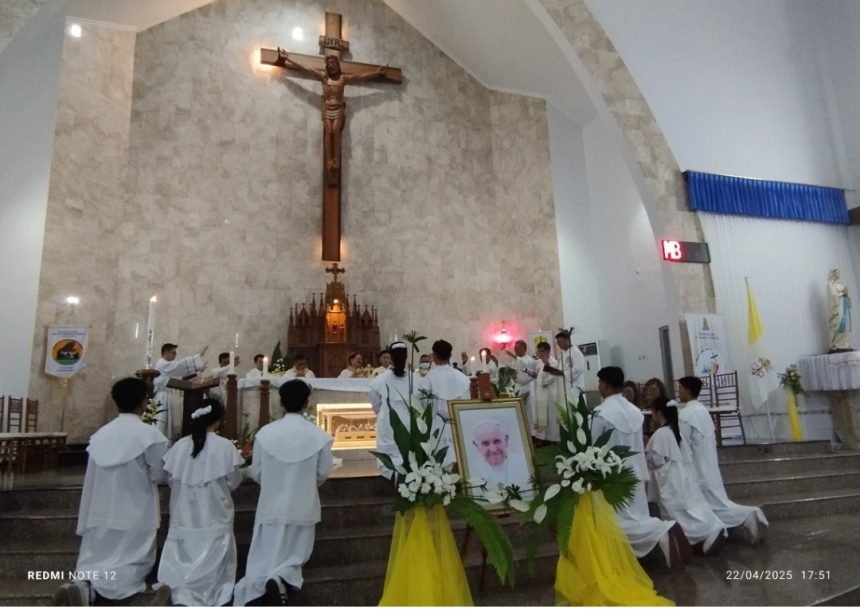 PALANGKARAYA – Gereja Katolik Paroki Katedral Santa Maria Palangkaraya, Kalimantan Tengah (Kalteng), menggelar Misa Requiem untuk Paus Fransiskus, Selasa (22/4/2025) sore. Misa dipimpin Uskup Palangkaraya Mgr Aloysius Maryadi Sutrisnaatmaka MSF sebagai Selebran utama, didampingi 12 orang Pastor Konselebran.