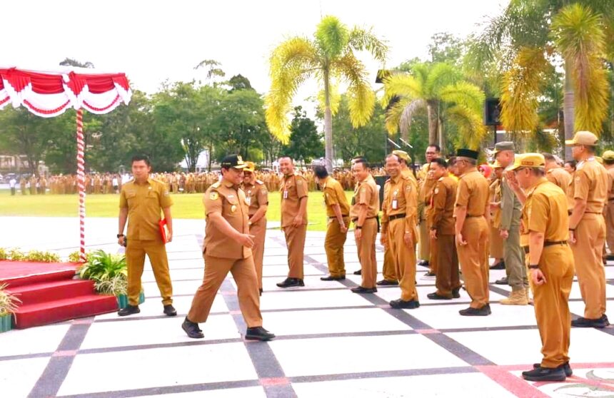 PALANGKARAYA – Mengawali tahun 2024, Pemprov Kalteng menggelar Apel Besar Aparatur Sipil Negara (ASN) dan Tenaga Kontrak, Selasa (2/1/2024). Apel hari pertama masuk kerja di tahun baru 2024 ini digelar di halaman Kantor Gubernur.