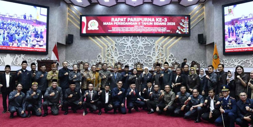 PALANGKARAYA – Dewan Perwakilan Rakyat Daerah Provinsi Kalimantan Tengah (DPRD Kalteng) menggelar Rapat Paripurna Pengumuman Usul Pemberhentian Gubernur H Sugianto Sabran dan Wakil Gubernur H Edy Pratowo masa jabatan 2020-2024 dan Usul Pengesahan Pengangkatan Calon Gubernur dan Wakil Gubernur masa jabatan 2025-2030, Agustiar Sabran-Edy Pratowo.