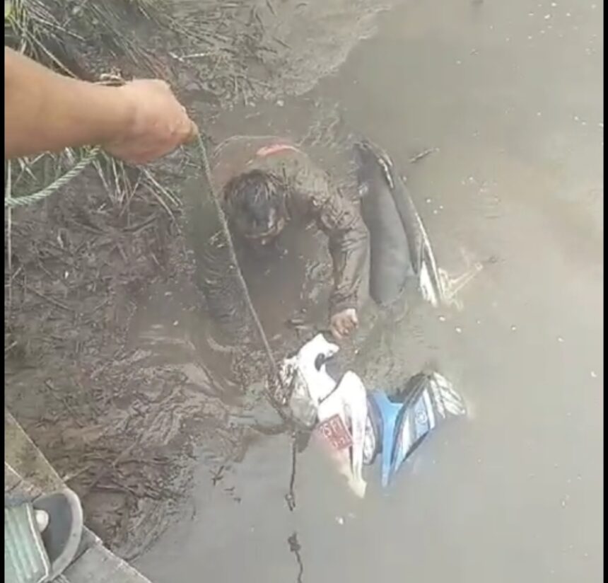 Seorang warga berusaha menolong korban yang jatuh ke sungai, menggunakan tali untuk menarik sepeda motornya.