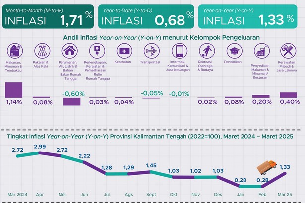 Sementara kelompok pengeluaran yang mengalami penurunan indeks, yaitu kelompok perumahan, air, listrik, dan bahan bakar rumah tangga sebesar 4,32 persen; kelompok transportasi sebesar 0,50 persen; dan kelompok informasi, komunikasi, dan jasa keuangan sebesar 0,13 persen. “Tingkat inflasi month-to-month (m-to-m) Provinsi Kalimantan Tengah pada Maret 2025 sebesar 1,71 persen dan tingkat inflasi year-to-date (y-to-d) Maret 2025 sebesar 0,68 persen,” kata Agnes. (VK1)