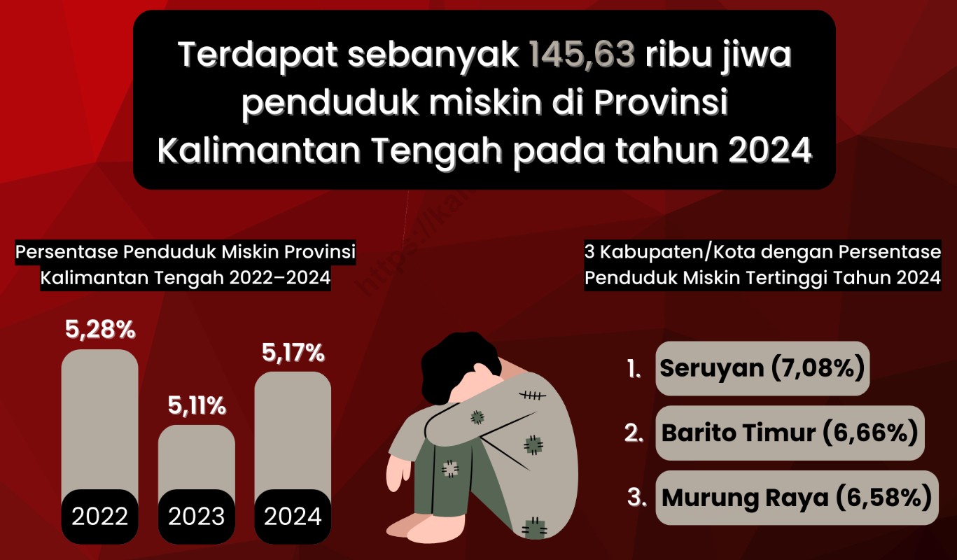 Tiga kabupaten dengan jumlah penduduk miskin paling banyak tahun 2024, yakni Seruyan 7,08 persen, Barito Timur 6,66 persen, dan Murung Raya 6,58 persen. Meski demikian, BPS mencatat tren angka kemiskinan di Provinsi Kalimantan Tengah dari 2012 hingga sekarang, jumlah penduduk miskin cenderung mengalami penurunan.
