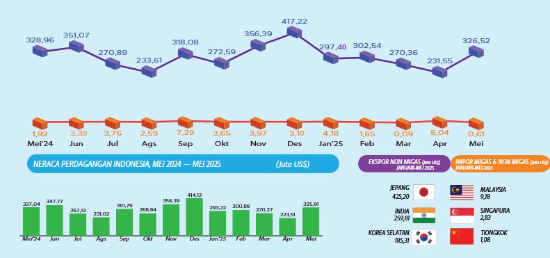 Data ini dirilis oleh Badan Pusat Statistik (BPS) Kalimantan Tengah (Kalteng), Selasa (1/7/2025). “Jepang, India, dan Korea Selatan menjadi negara tujuan utama ekspor Kalimantan Tengah selama Januari-Mei 2025,” kata Kepala BPS Kalteng Agnes Widiastuti, saat press rilis.