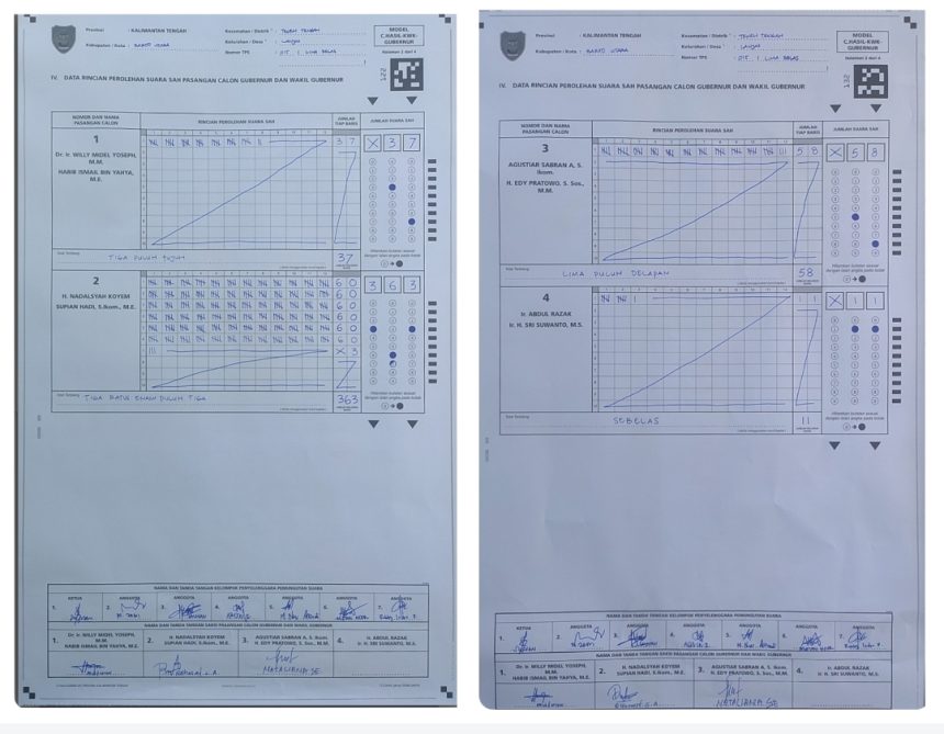 Hasil perhitungan suara, berdasarkan model C1 yang diunggah dari laman https://pilkada2024.kpu.go.id, diketahui pasangan nomor urut 2 meraih suara terbanyak 363 suara. Pesaing terdekatnya, yakni paslon nomor urut 3 Agustiar Sabran – Edy Pratowo meraih 58 suara, disusul paslon nomor urut 1 Willy M Yoseph – Habib Ismail 37 suara, dan paslon nomor urut 4 Abdul Razak – Sri Suwanto 9 suara.