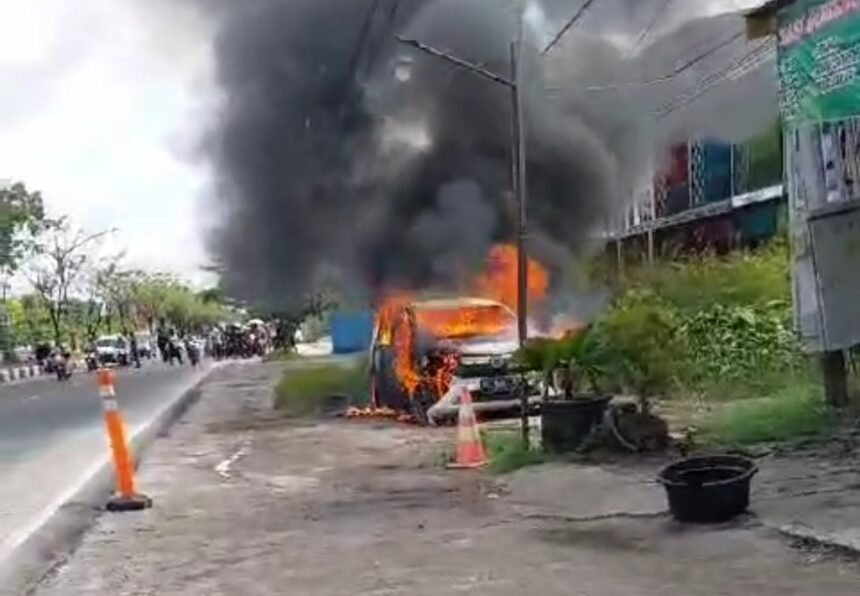 PALANGKARAYA – Sebuah mobil Daihatsu Sigra meledak lalu terbakar di tepi Jalan Yos Sudarso Palangkaraya, Jumat (8/12/2023). Saksi mata di TKP menyebutkan, mobil dengan nomor polisi KH 1601 TR itu sebelumnya keluar dari Stasiun Pengisian Bahan Bakar Umum (SPBU). Persis di depan warung Gudeg Jogja Pak Is, mobil itu mengeluarkan bunyi ledakan, disusul sambaran api.