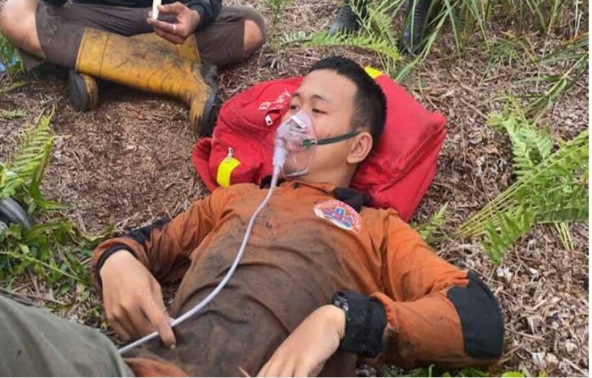 Salah satu anggota ERP dibantu dengan oksigen karena mengalami sesak napas saat memadamkan api.
