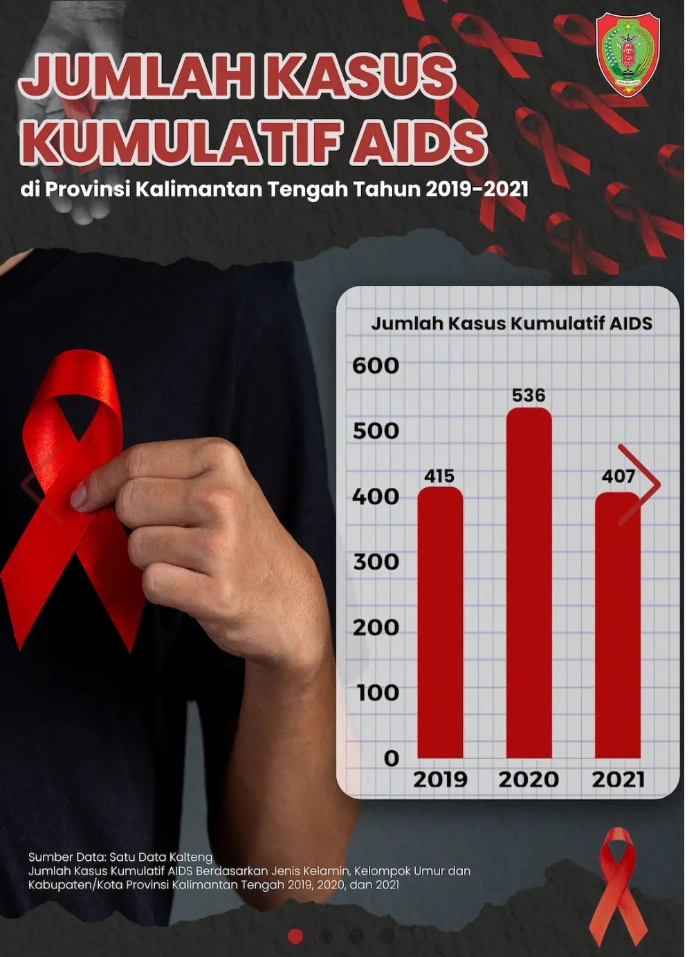 Merujuk laman satudata.kalteng.go.id milik Pemprov Kalteng yang dirilis pada Kamis (28/11/2023), secara kumulatif data AIDS dari tahun 2019 hingga tahun 2021, yakni tahun 2019 tercatat 415 kasus, tahun 2020 sebanyak 536 kasus, dan tahun 2021 sebanyak 407 kasus.