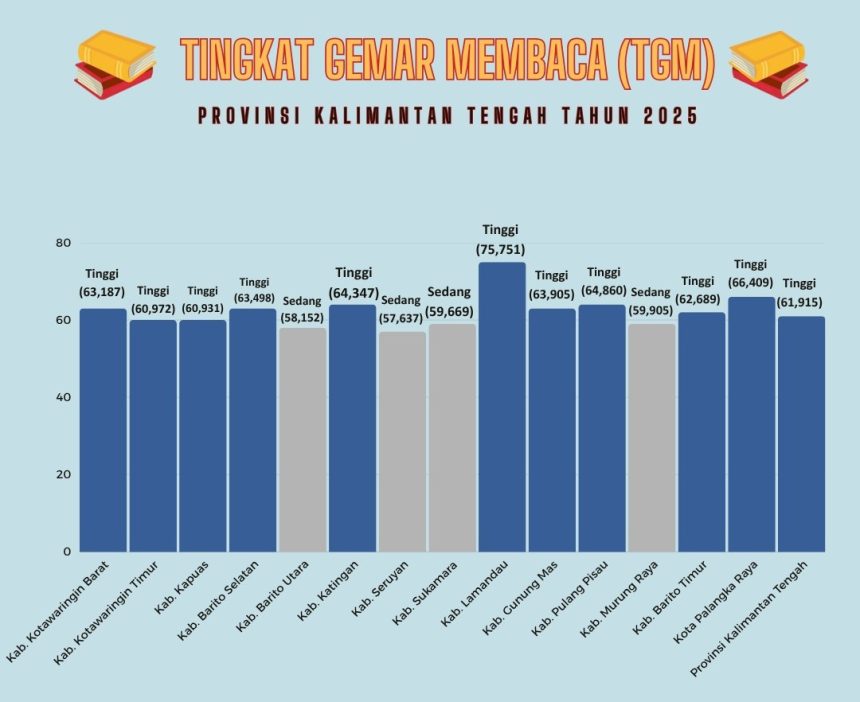 PALANGKARAYA–Kabupaten Lamandau tercatat sebagai daerah dengan tingkat gemar membaca paling tinggi di tahun 2025 di Provinsi Kalimantan Tengah (Kalteng). Berdasarkan laporan hasil survei Tingkat Gemar Membaca (TGM) Tahun 2025, Lamandau mencatat angka 75,751, disusul Kota Palangkaraya 66,409 dan Pulang Pisau 64,860. Seruyan menjadi kabupaten dengan TGM paling rendah, yakni hanya 57,637. Di atas Seruyan ada Barito Utara 58,152 dan Sukamara 59,669.