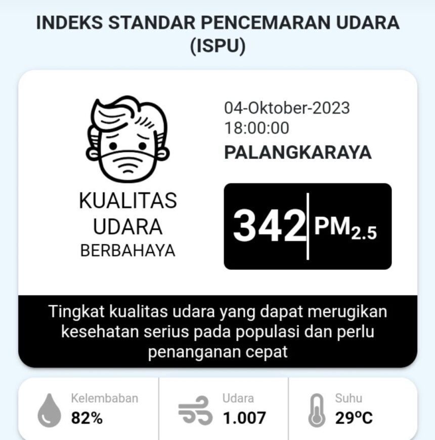 PALANGKA RAYA – Kualitas udara Kota Palangka Raya, Rabu (4/10/2023), memasuki level berbahaya berdasarkan Data Indeks Standar Pencemaran Udara (ISPU). Dinas Pendidikan (Disdik) Kota Palangka Raya dengan tanggap kembali mengeluarkan surat edaran (SE)terbaru, Rabu malam.